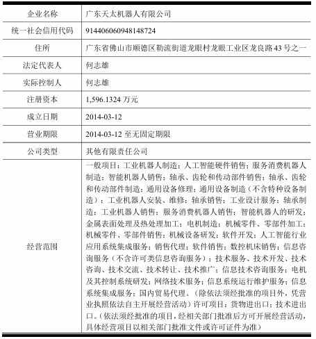 公告显示,广东天太机器人有限公司成立于2014年3月,法定代表人何志雄,注册资本为1596.13万元。其经营范围包括工业机器人制造,人工智能硬件销售,服务消费机器人制造,轴承、齿轮和传动部件销售等。